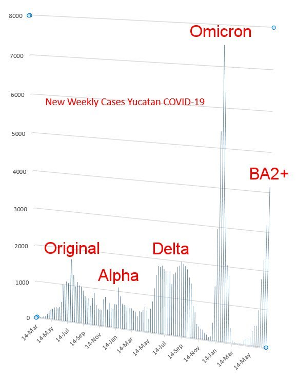 And yes, Virginia … If this latest 12 week long peak looks troubling, realize that it is only going to get worse this coming 3 months, because the even nastier strains of Omicron BA.5 & BA.6 that are currently ravaging the USA, have NOT YET gotten here to Yucatan.