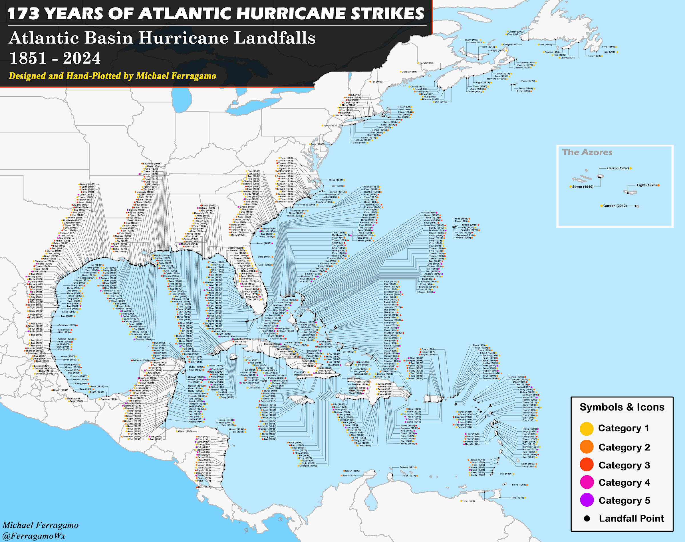 How do we know/ …. A diligent fellow confirmed these realities in his report of the historical records of all documented hurricanes to hit the US Coast, the Caribbean Islands, and the Yucatan Peninsula. His report also includes a convenient map of all officially-recorded hurricane landfalls for these areas.