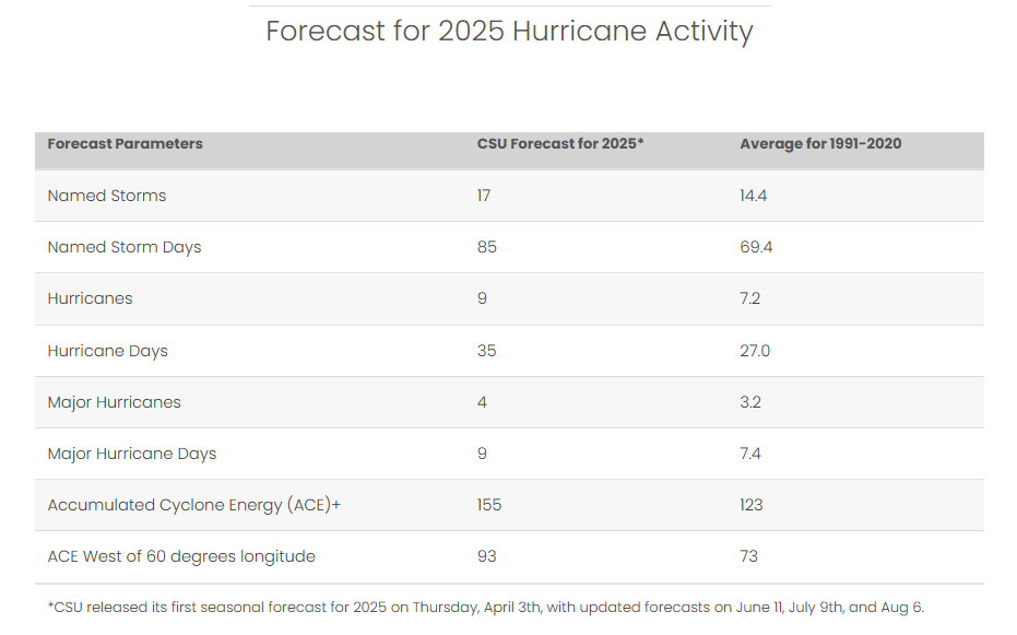 (“Above normal activity for 2025 – with 17 predicted named Atlantic storms … versus 14.4 average,)
