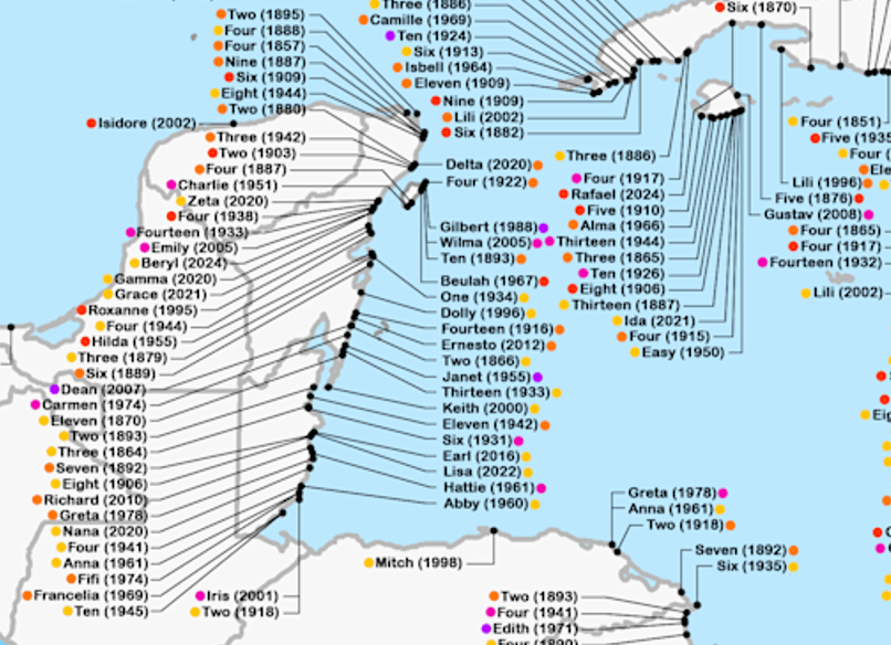 Note how empty our Yucatan North Coast is …. free from dots of documented hurricane landfalls.