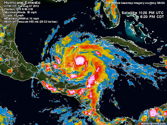 Ernesto did strengthen as the center reached the Bay of Campeche, and it is predicted to continue to strengthen until about 11 AM Thursday (today). It still packs a punch with heavy rains and 45-75 mph winds near the coast, diminishing to 45 mph inland. The center should move WSW across Mexico, and move into the Pacific exiting Guerro by about 9 AM Friday. This means rain for Vera Cruz and Tabasco can continue until Friday AM.