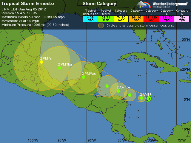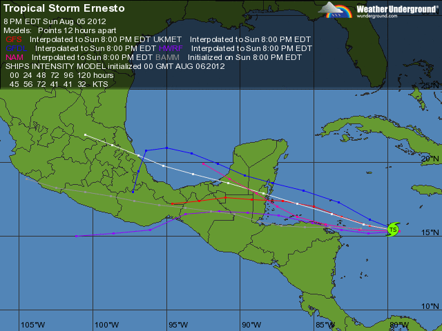 Tropical Storm Ernesto has been gaining strength today. At 4 PM Monday, Ernesto has 65 mph sustained winds with gusts up to 75 mph. It’s current most likely path takes the storm center south of Yucatan State, with the computer models converging on Chetumal, Quintana Roo, with the center of the storm making landfall at 2 AM Wednesday.