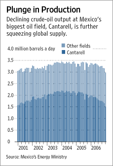 “Output from Cantarell fell (another) 36 percent in July, (2010), to 973,668 barrels a day from 1.526 million a year earlier, the Energy Ministry said Aug. 21. (PEMEX CEO) Reyes Heroles said production this year may end up at about 2.85 million barrels a day. ”