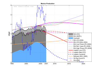 - The bottom blue-dotted curve (Cantarall output) is the one that scares Mexican politicians and oil-industry experts the most, since PEMEX has been able to temporarily maintain output (within 6% of peak values) by boosting production at other fields. The big remaining question is: How long can PEMEX increase production further in existing fields as Cantarell’s output falls further, without also exhausting all their other fields?