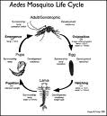 If her squiggling ¼ inch larvae avoid little fish and other predators, they morph (turn) into little mosquitoes. So, in just seven (7) days after laying the eggs, Bastet has a new batch of flying juvenile mosquitoes, as long as the Humans don’t flush the drain or treat the drain with ammonia or bleach or insecticide. Her newly emerging girl-babies fly-off to look for a little woo-woo and then a blood meal. Her boy-babies head to the garden to look for fruit or leaves to suck sugary solutions, and a maybe if lucky: a little woo-woo too.