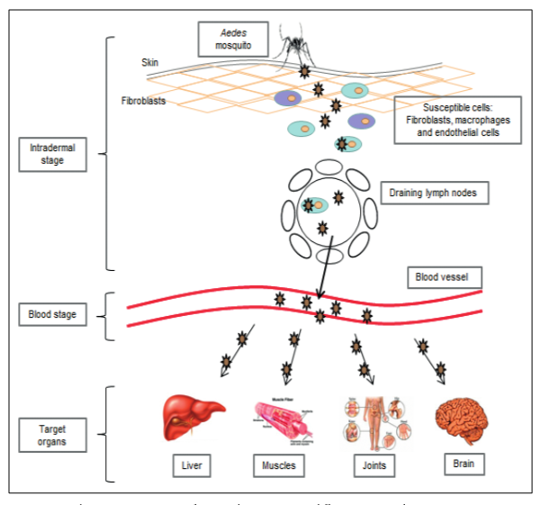 Specifically, CHIKV viral replication takes place in our fibroblasts, macrophages and endothelial cells. The infection causes a series of strong innate immunilogical responses, producing numerous pro-inflammatory mediator compounds.